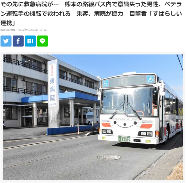 12月中旬、熊本市内を走行中の路線バス内で20代の男性が意識を失ったが、バス運転手の機転と、他の乗客や近くの病院の見事な連携によって救われる事案があった。